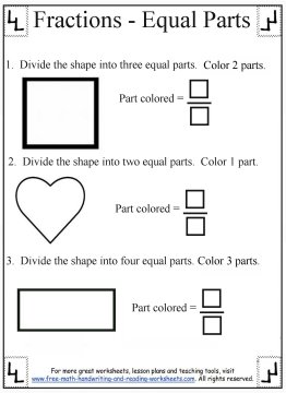 Printable Fraction Worksheets:Equal Parts There are three problems on each activity sheet--one for halves, thirds, and fourths. The student is presented with a shape and then asked to divide it into two, three, or four equal parts. Have your child draw lines through each shape and then color in the amount asked in each problem. On the right is an empty fraction with two blank boxes.